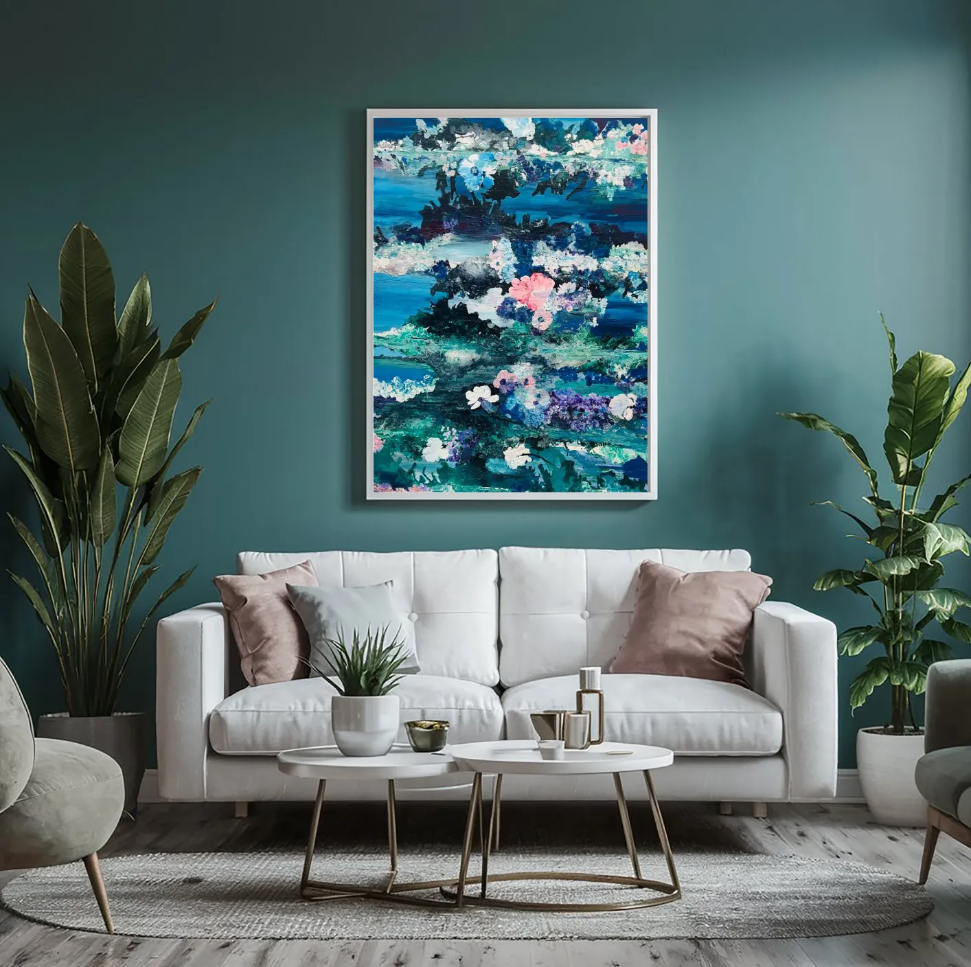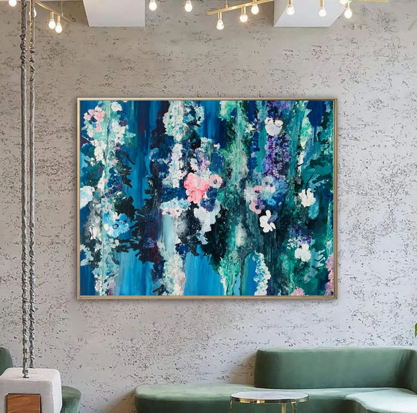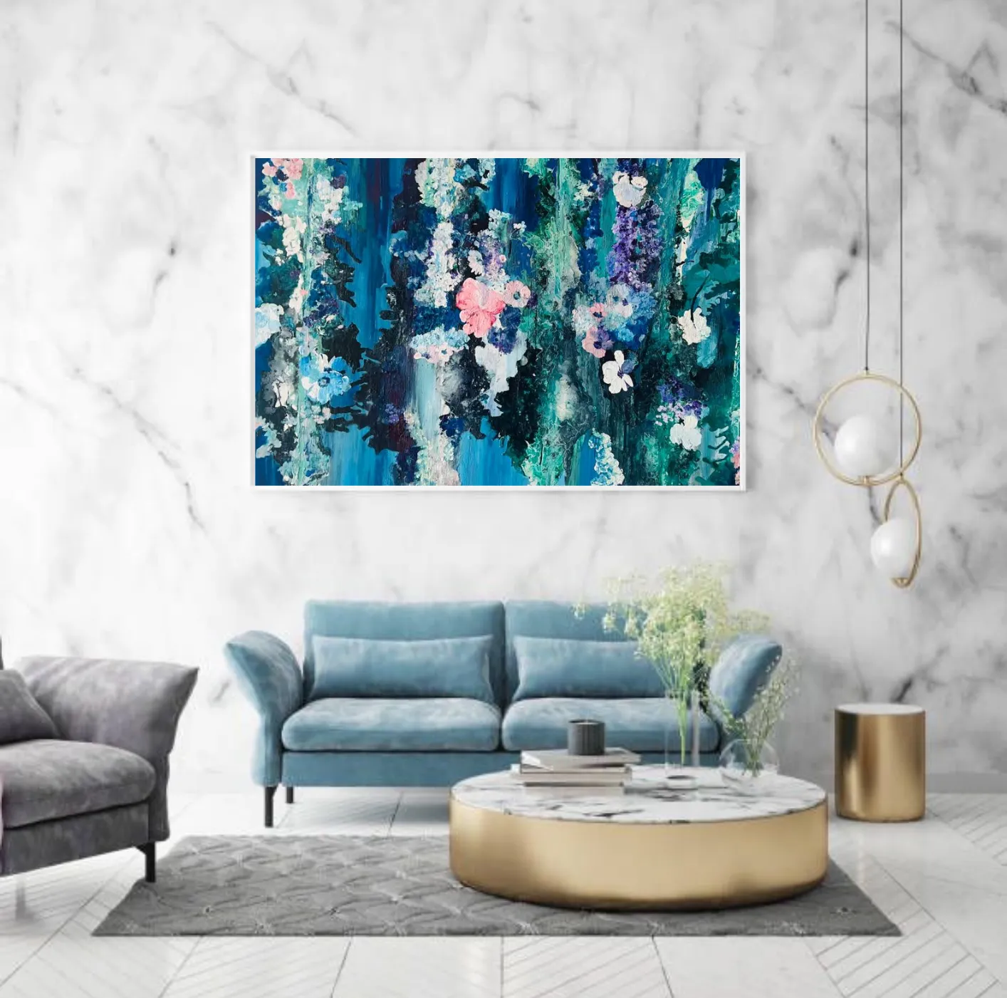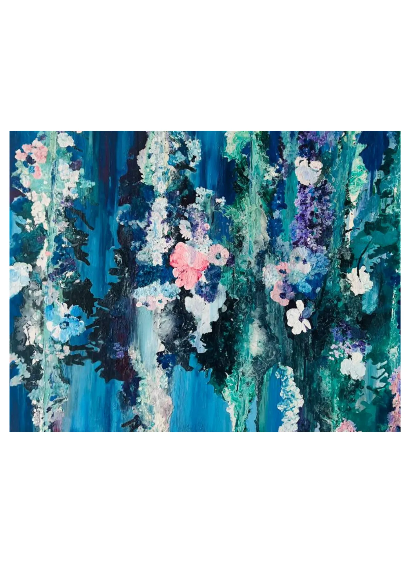 “Between Then and Now” is a light blue floral painting that captures the delicate passage of time. The soft hues evoke a sense of tranquility, while the flowers represent the fleeting moments