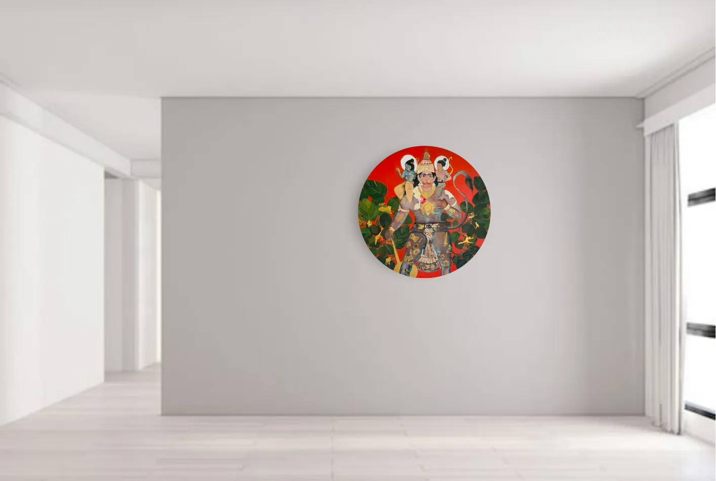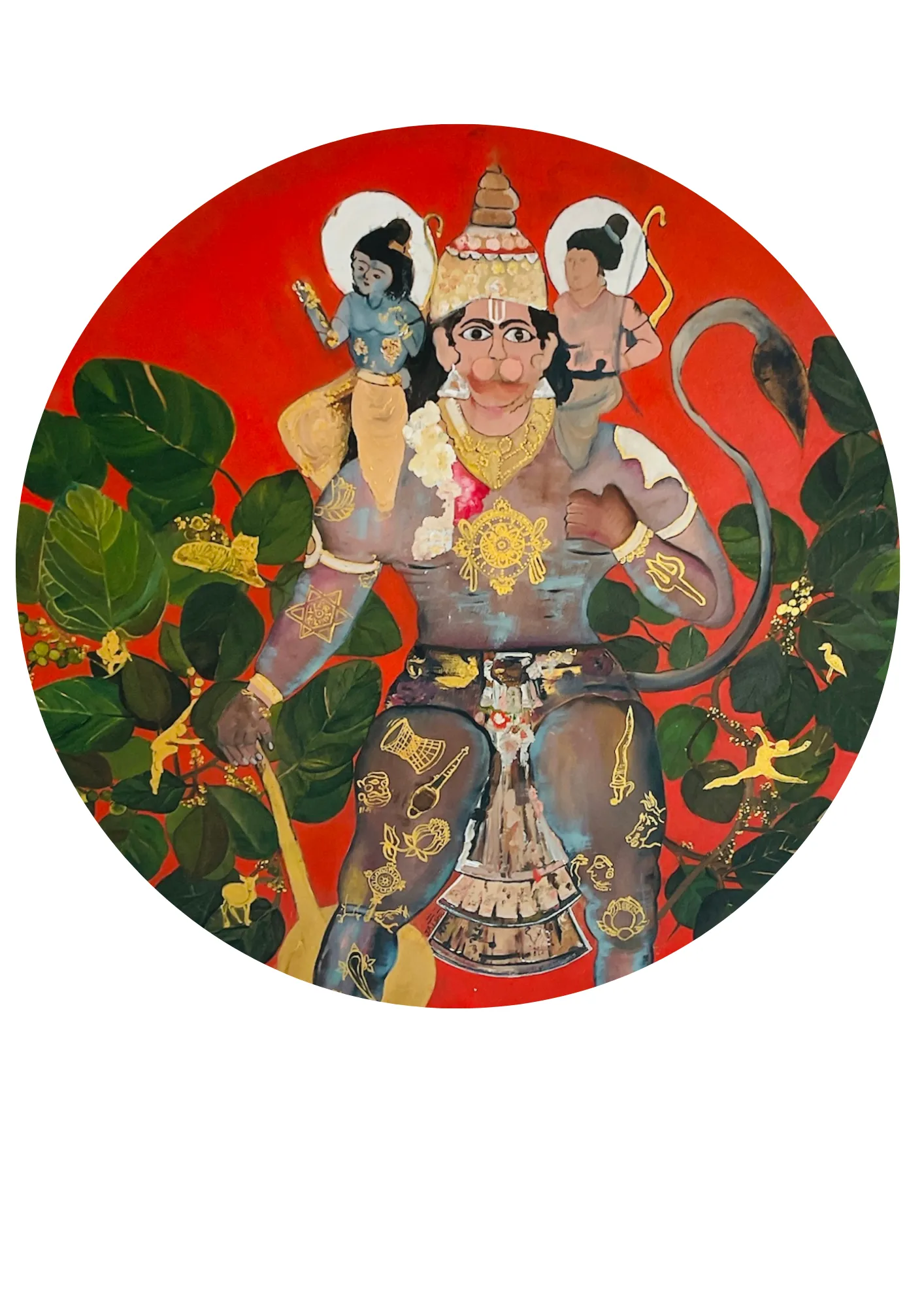 This painting captures the power and devotion of Lord Hanuman, with Lord Ram and Laxman seated on his broad shoulders. The bright terracotta background and green foliage accentuate the vibrancy of the scene, drawing the viewer’s eyes to the central figure.