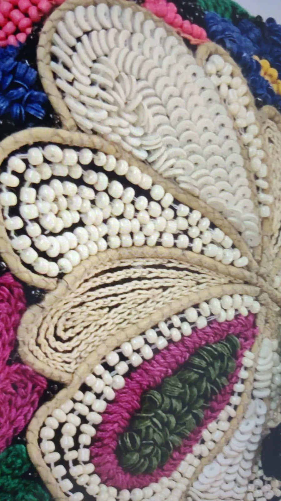 Leather stings, sequence, beads, thread braids, wooden beads, uncut stone