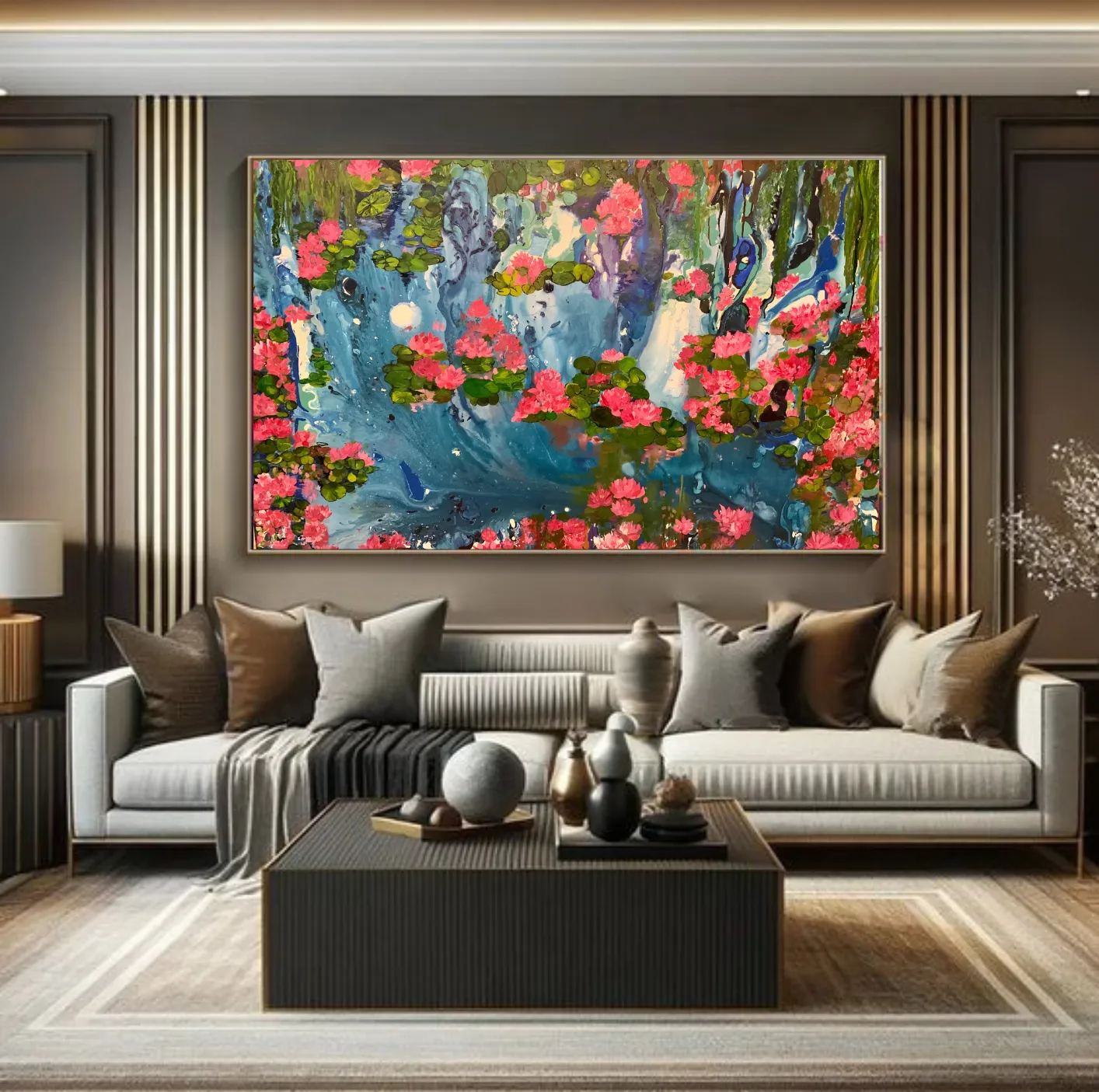 “Water Lilies” is a floral painting that captures the serene beauty of flowers floating gracefully on water. The abstract portrayal of the lilies evokes a sense of tranquility, as the delicate blooms